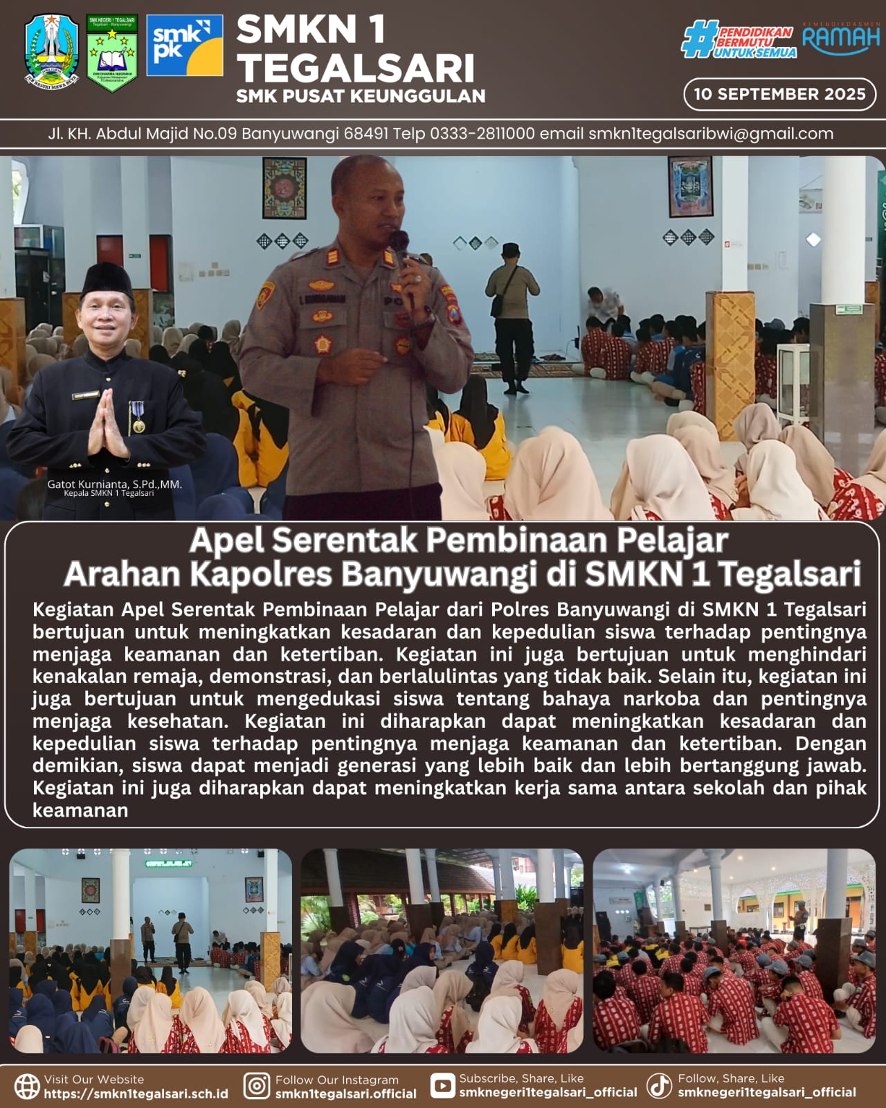 Polres Banyuwangi mengadakan Apel Serentak Pembinaan Pelajar di SMKN 1 Tegalsari untuk meningkatkan kesadaran dan kepedulian siswa akan pentingnya menjaga keamanan dan ketertiban. Kegiatan ini juga bertujuan untuk mencegah kenakalan remaja, seperti demonstrasi anarkis dan balap liar. Selain itu, pembinaan ini juga memberikan edukasi tentang bahaya narkoba dan pentingnya menjaga kesehatan, lho!