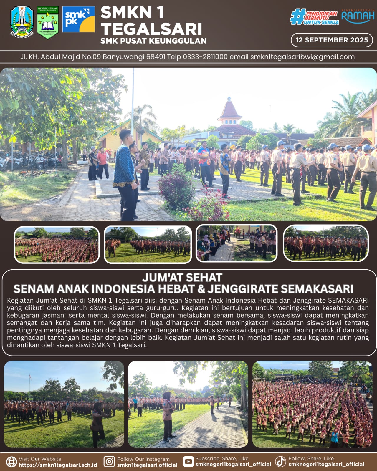 SMKN 1 Tegalsari mengadakan kegiatan rutin “Senam Anak Indonesia Hebat dan Jenggirat Semakarsari” setiap Jumat. Kegiatan ini diikuti oleh seluruh siswa dan guru-guru, dengan tujuan utama untuk meningkatkan kesehatan dan kebugaran fisik serta mental. Melalui senam bersama, diharapkan siswa-siswi dapat meningkatkan semangat dan kerja sama.