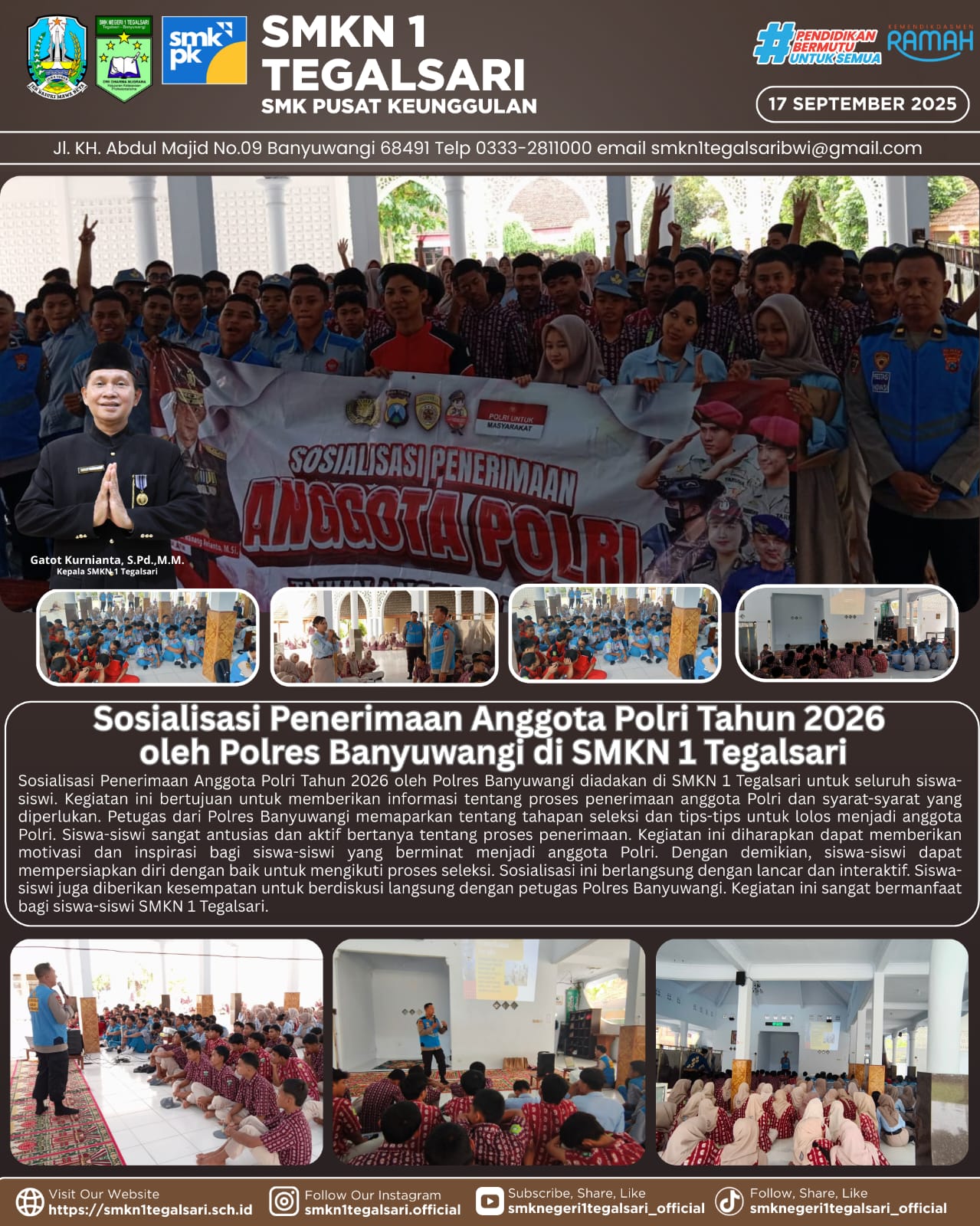Polres Banyuwangi menyelenggarakan kegiatan sosialisasi penerimaan anggota Polri tahun 2026 di SMKN 1 Tegalsari. Kegiatan ini bertujuan untuk memberikan informasi komprehensif kepada seluruh siswa tentang tahapan, persyaratan, dan manfaat bergabung dengan kepolisian. Acara ini disambut dengan antusias oleh para siswa yang berinteraksi aktif dengan petugas. Para siswa mendapatkan motivasi dan inspirasi untuk mengejar karier di kepolisian.